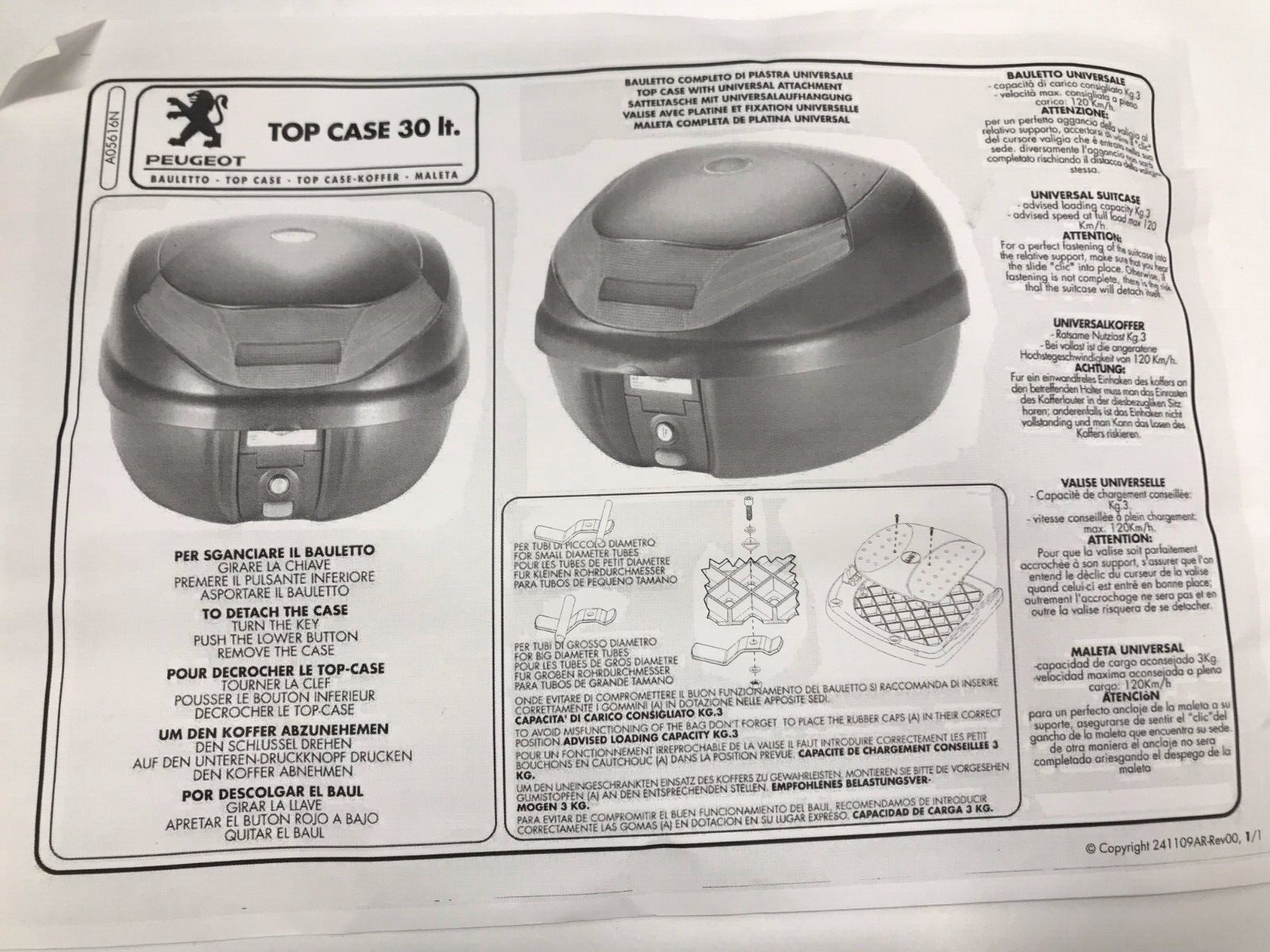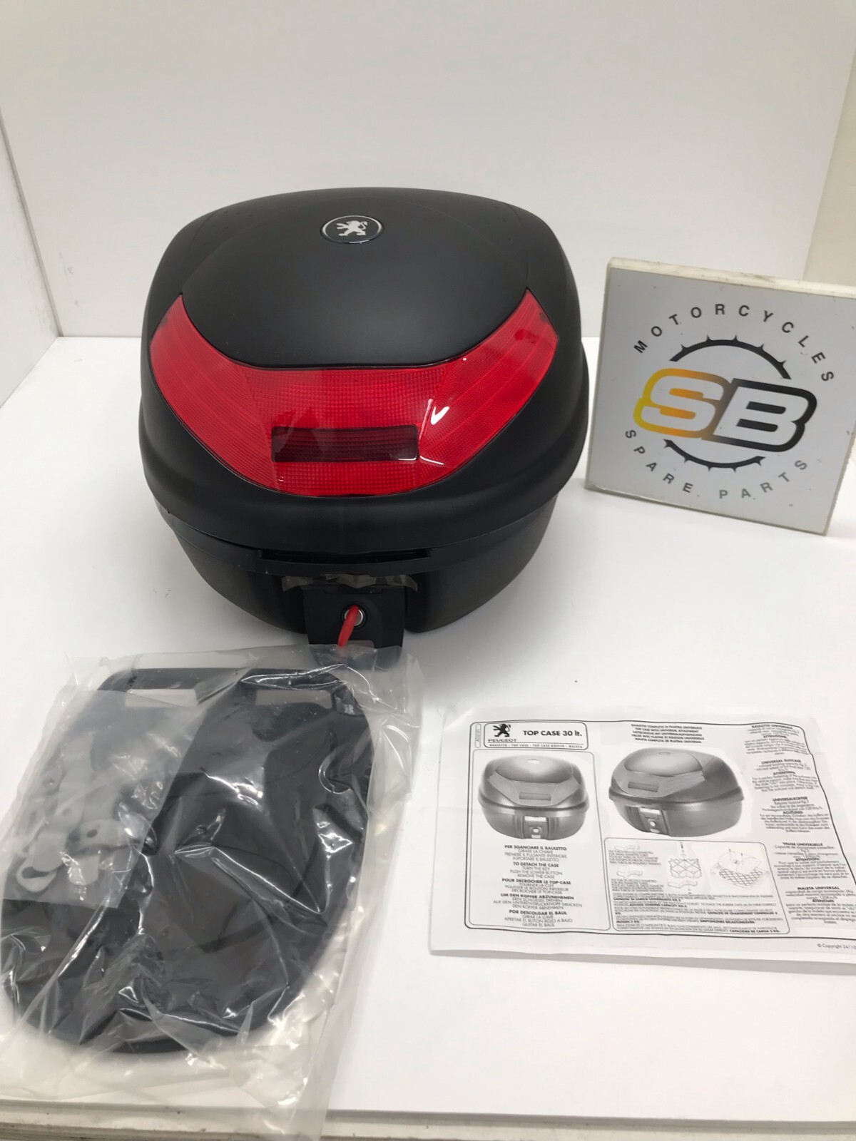 COFFRE TOP CASE 30 LITRES ET PLAQUE D’ORIGINE D’OCCASION POUR PEUGEOT.
