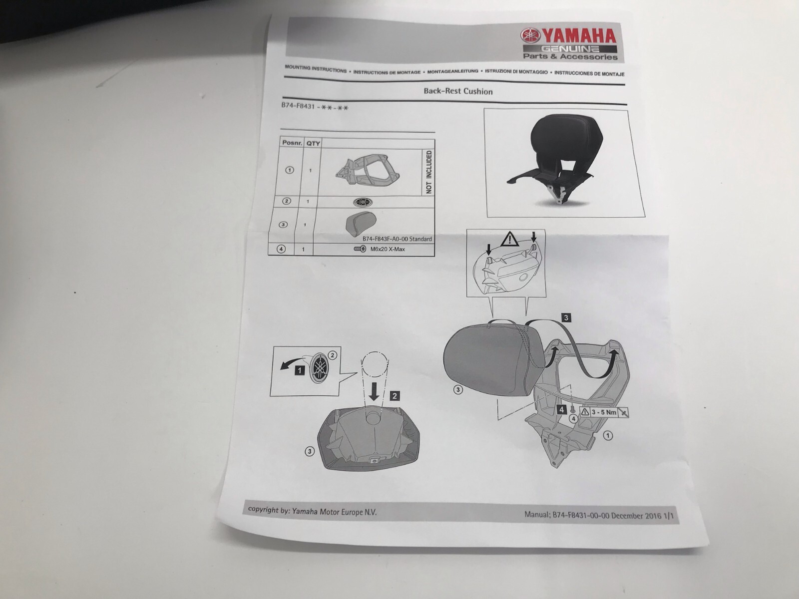 YAMAHA TRICITY 125 RÜCKENLEHNE VON 2017 BIS 2021.